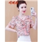 情相遇 雪纺衫女短袖夏季新款韩版时尚V领荷叶边碎花百搭上衣宽松显瘦遮肚气质小衫 粉色 L