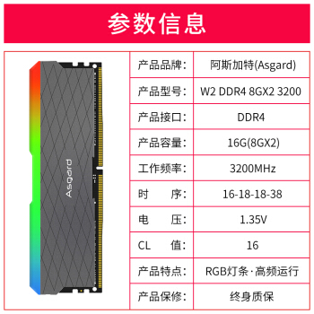 阿斯加特(Asgard)16GB(8Gx2)套装 3200频率 DDR4 台式机内存条 RGB灯条-兼容各种灯效/W2 |