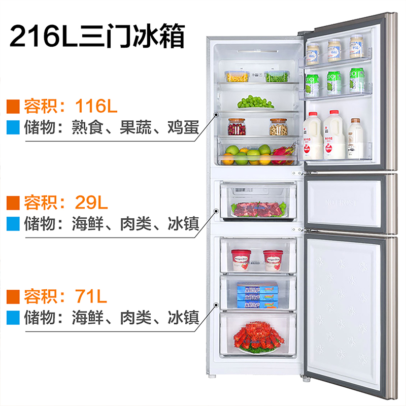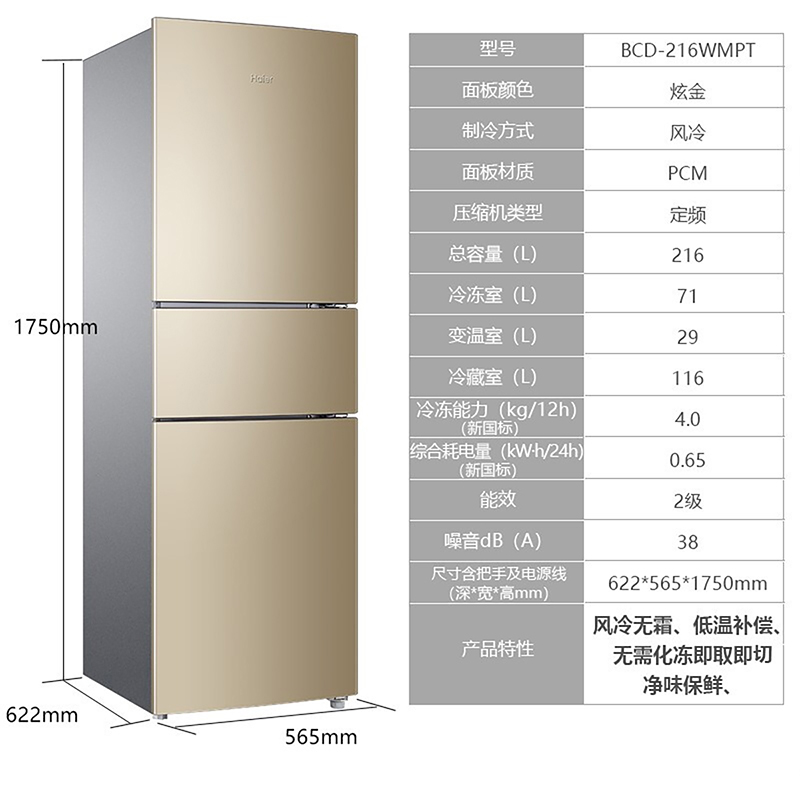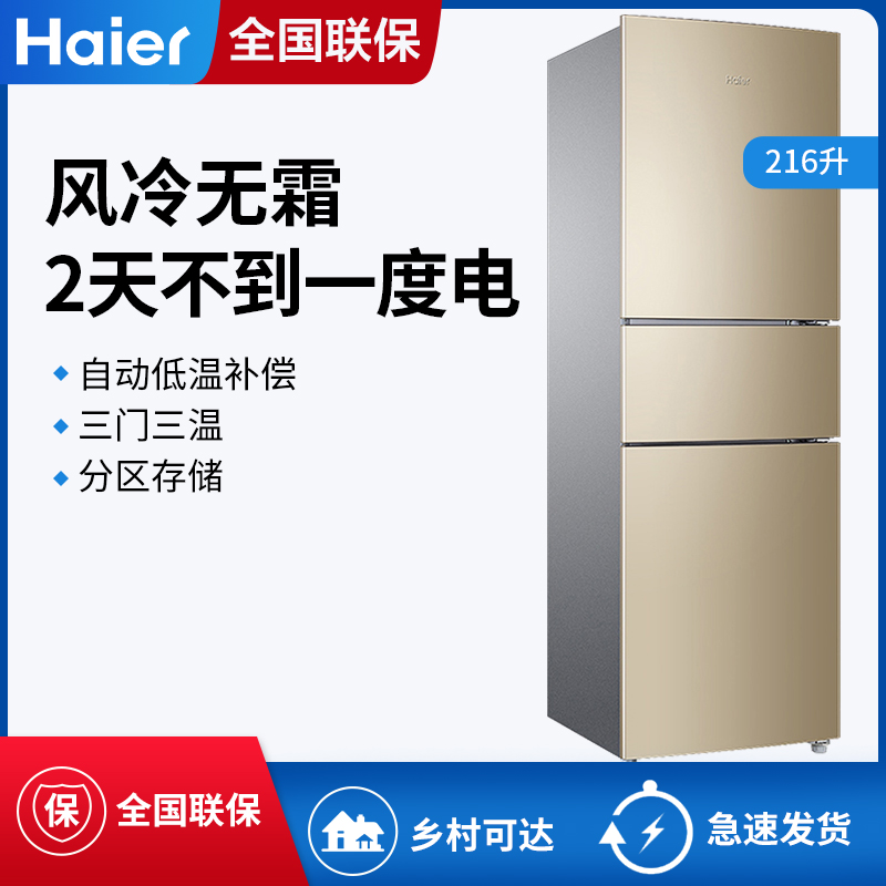 Haier/海尔 BCD-216WMPT家用小型三门多门风冷无霜节能静音电冰箱【PCM彩涂板/炫金】 |