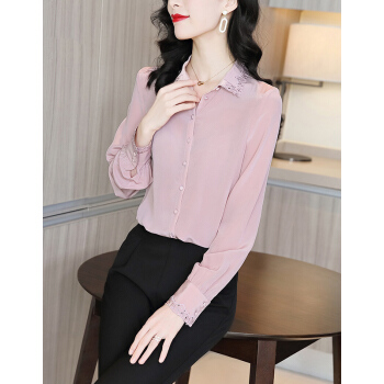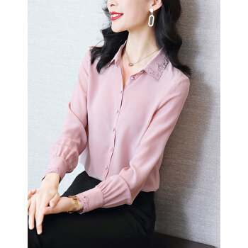 南极人 衬衫女长袖秋季新款韩版时尚宽松女装衬衣气质翻领蕾丝勾花刺绣小衫上衣潮 粉色 M |