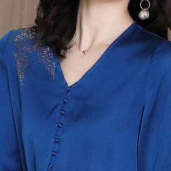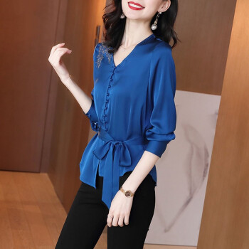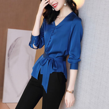 微尚瑶衬衫女秋季新款复古港风气质V领洋气系带上衣女时尚百搭纯色休闲长袖衬衫女7331 蓝色 请拍正确尺码 |
