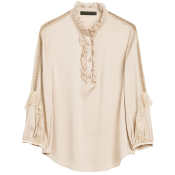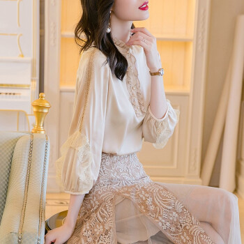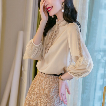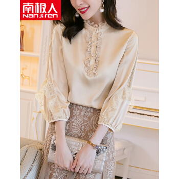南极人 衬衫女夏季新款长袖女装衬衣韩版时尚木耳边立领镂空蕾丝拼接上衣潮 N4-DGB405-6890-香槟色 M |