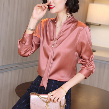 微尚瑶衬衫女秋季新款韩版气质减龄立领系带纽扣上衣女百搭休闲纯色V领衬衣女6976 粉色 请拍正确尺码 |