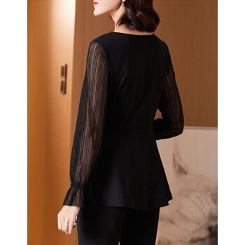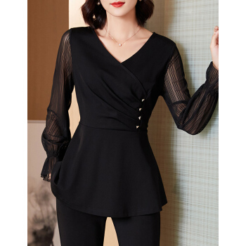 南极人 衬衫女长袖夏季新款女装韩版时尚显瘦减龄衬衣洋气设计感上衣网纱拼接V领雪纺小衫 N4-GDB405-6886-黑色 M |