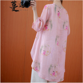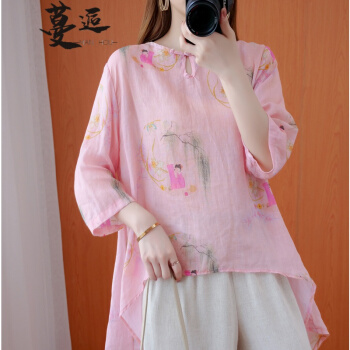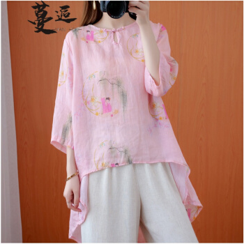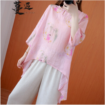 蔓逅 棉麻衬衫女民族风夏季新款文艺复古大码女装宽松显瘦中长款不规则遮肚减龄中国风印花小衫上衣 图片色 大码L【建议100-140斤】 |