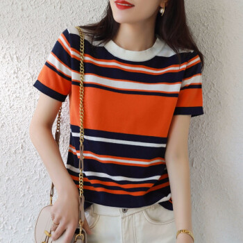 凝拉短袖T恤女纯棉夏季新款女装上衣韩版时尚气质宽松大码显瘦圆领拼色条纹针织打底小衫 条纹 2XL(建议130-145斤) |