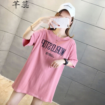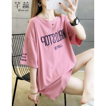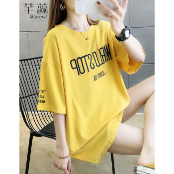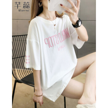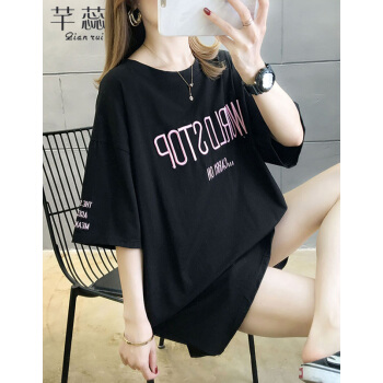 芊蕊短袖t恤女夏季新款韩版宽松大码女装中长款刺绣字母圆领短袖体恤上衣潮 黑色 L |