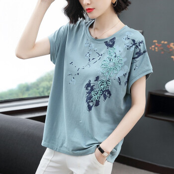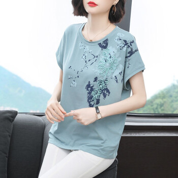 【精选好货】晞薇夏装新款年棉女装立体花朵拼接图案碎花短袖T恤女上衣大码中年妈妈半袖t桖夏 豆绿 M |