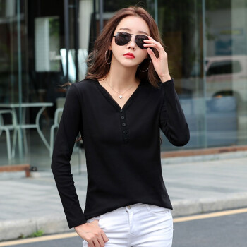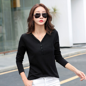南极人 长袖t恤女95棉秋季女装新款韩版时尚V领纯色白色简约百搭修身显瘦上衣打底衫 XX39 高级黑 M |