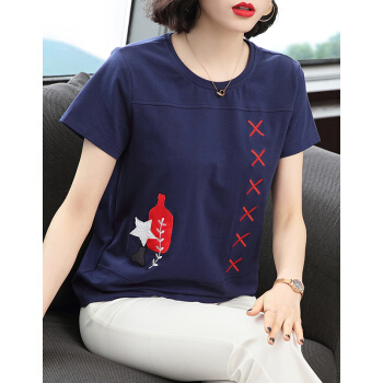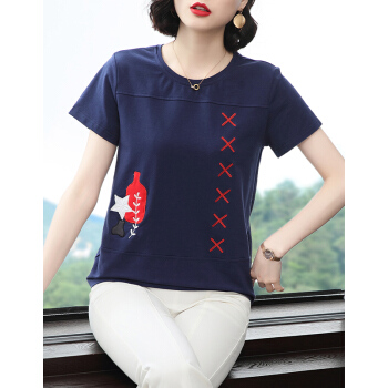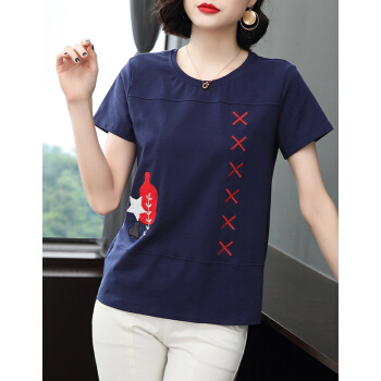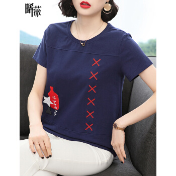 【精选好货】晞薇妈妈夏装小衫T恤短袖女新款中年妇女大码女装显瘦遮肚体桖棉宽松休闲上衣女 深蓝色 请拍正确尺码 |
