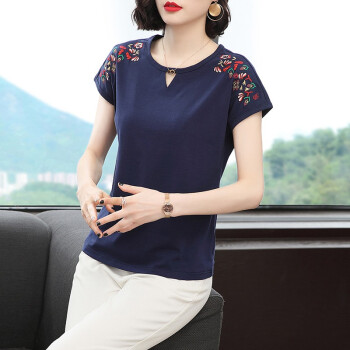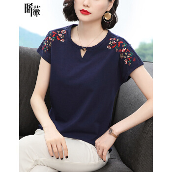 【精选好货】晞薇棉短袖t恤女新款夏季时尚显瘦碎花半袖上衣宽松刺绣中年妈妈女装t桖 深蓝色 请拍正确尺码 |