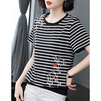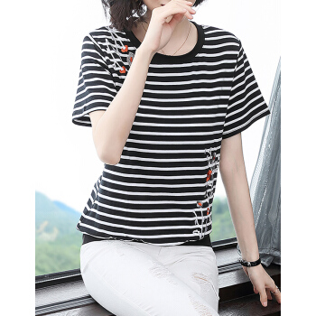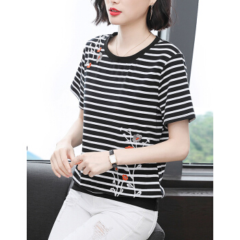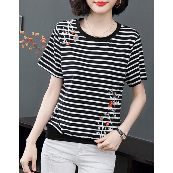 【精选好货】韩可思夏装新款女士条纹T恤女短袖韩版时尚宽松半袖百搭绣花上衣棉大码体桖夏 条纹 请拍正确尺码 |
