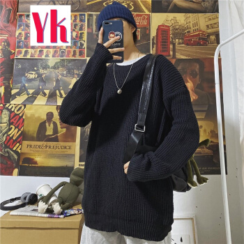 港风潮流ins慵懒风毛线衣情侣纯色圆领针织衫韩版宽松学生毛衣男 黑色 M |