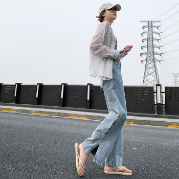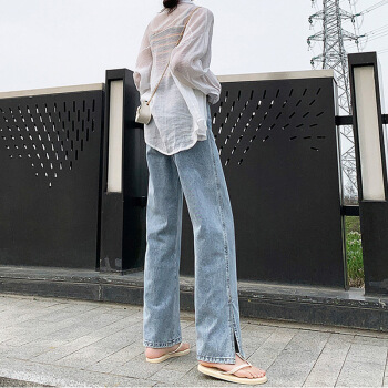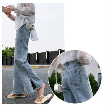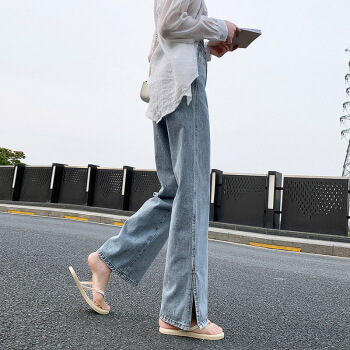 开叉阔腿牛仔裤女直筒宽松泫雅风高腰夏季薄款垂感拖地裤 蓝色 XXS |