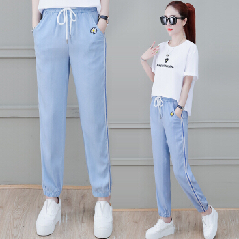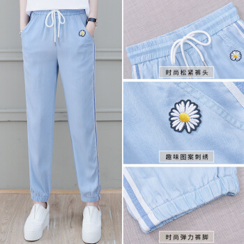 茉玥天丝小雏菊牛仔裤女夏季新款直筒松紧侧条纹运动休闲九分裤子 蓝色 请拍正确尺码 |
