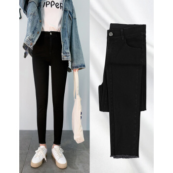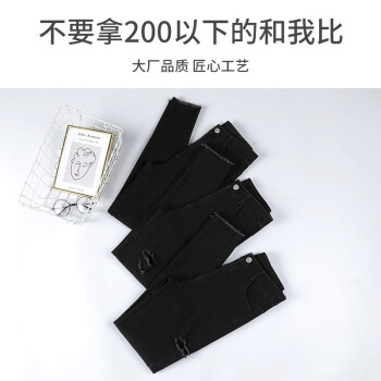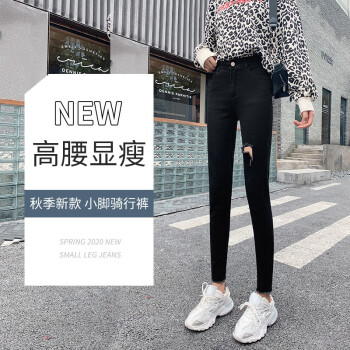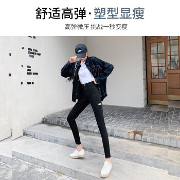 右昀 紧身牛仔裤女裤子夏季薄款新款黑色高腰春秋打底裤女外穿修身九分显瘦网红百搭破洞铅笔小脚裤 常规款-黑色 L【适合105-115斤】 |