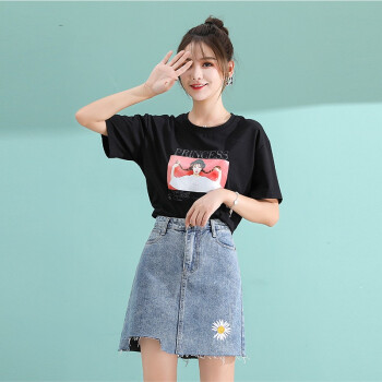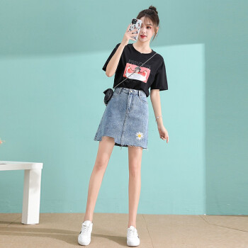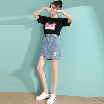 阅樱牛仔半身裙女短裙 新款小雏菊刺绣裙不规则显瘦高腰a字短裙包臀裙一步裙夏学生裙子 蓝色(单裙款) L |