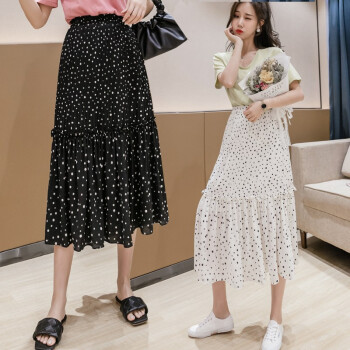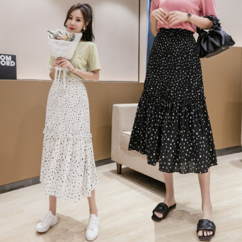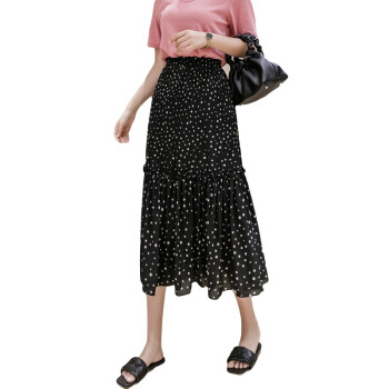 五个橘子半身裙女中长款雪纺裙子新款女装夏季波点裙韩版松紧高腰A字半身裙伞裙蓬蓬裙垂感显瘦 黑色 均码(85-130斤) |