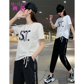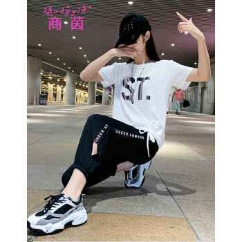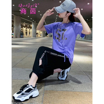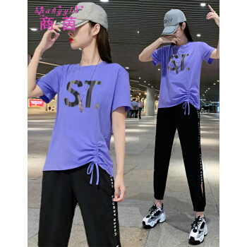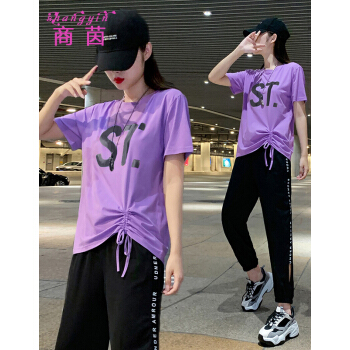 商茵SY休闲运动套装女休闲裤女夏新款韩版时尚休闲服纯棉宽松大码显瘦时尚减龄两件套潮 紫色套装 M(建议85-100斤) |