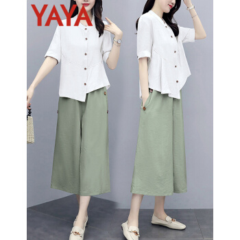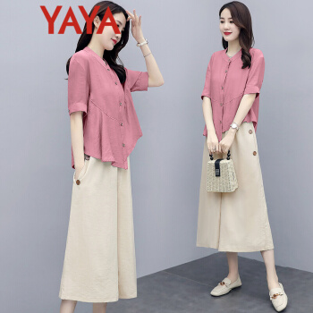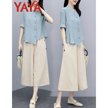 鸭鸭服饰yaya休闲裤女女装夏季新款棉麻套装时尚洋气减龄显瘦文艺气质复古阔腿裤女两件套装女 蓝衣米裤 请选择正确尺码 |