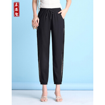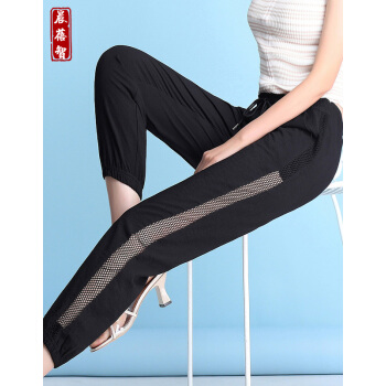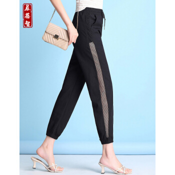 晨蓓智cbz休闲裤女夏季冰丝棉麻网纱拼接宽松大码女装百搭哈伦裤高腰九分运动小脚裤显瘦薄款 黑色 M【建议85-103斤】 |