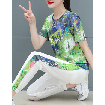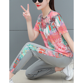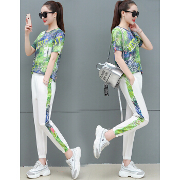 婪澈休闲裤女女装夏季新款宽松韩版潮流短袖长裤印花显瘦洋气两件套套装女 蓝色 请下正确尺码 |