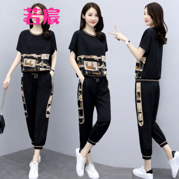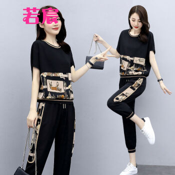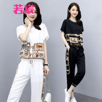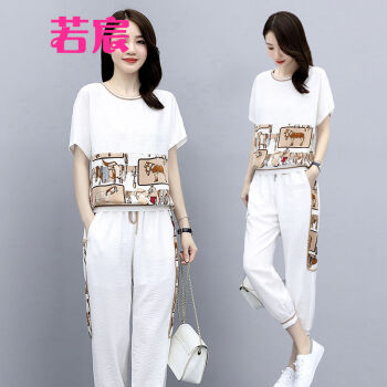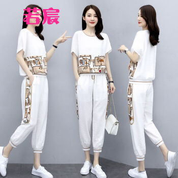 若宸两件套套装女夏休闲裤女运动九分时尚束脚裤大码女装冰丝裤子 白色 M |