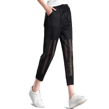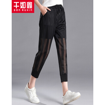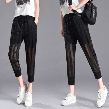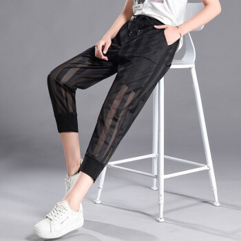 干如鑫休闲裤女运动裤女夏季新款时尚网纱哈伦裤子女学生显瘦七分裤宽松运动百搭高腰大码灯笼裤女潮 图片色(黑色) M(90-100斤) |