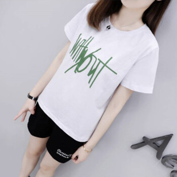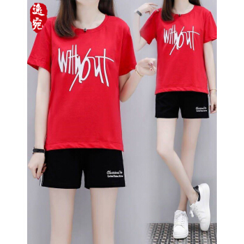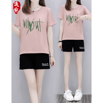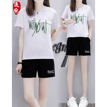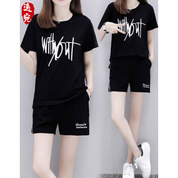 逸宛yw短裤女运动休闲套装女夏装新款大码运动服时尚印花短袖短裤两件套跑步服女学生宽松套装 黑色 M【建议85-105斤】 |