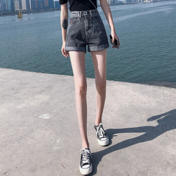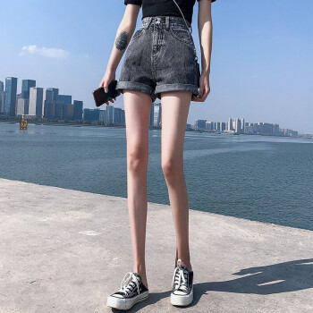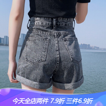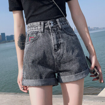 沫澜仟衣高腰牛仔短裤女夏季新款韩版宽松显瘦阔腿裤子女休闲百搭外穿a字热裤优质面料 黑灰 XL |