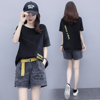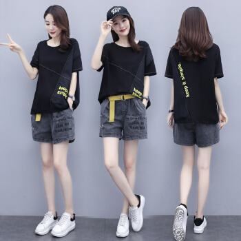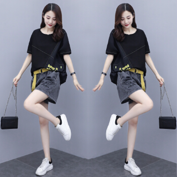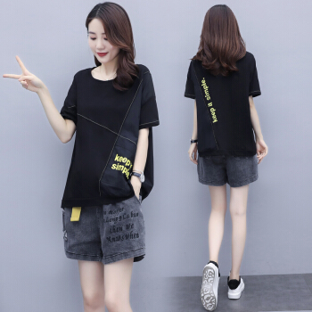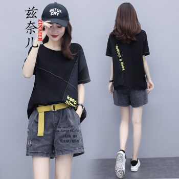 兹奈儿夏季新款时尚印花百搭潮流半袖短袖T恤+刺绣宽松松紧牛仔短裤女宽松新品套装两件套 黑色 M |
