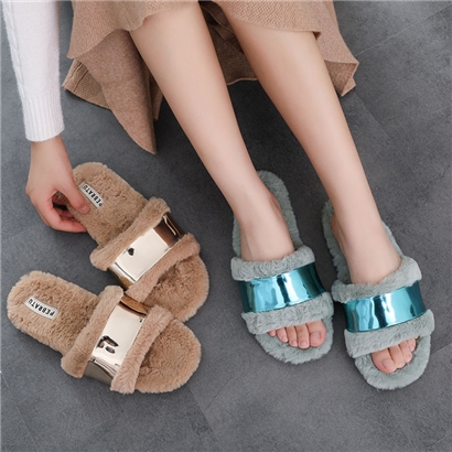 时尚亮片毛绒开口外穿毛拖鞋【短毛绒/浅绿】 |