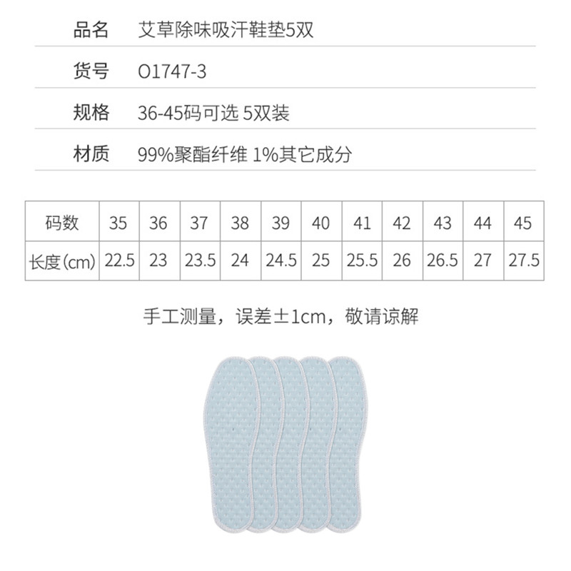 艾草除味吸汗鞋垫5双装【99%聚酯纤维 1%其它成分/图片色】 |