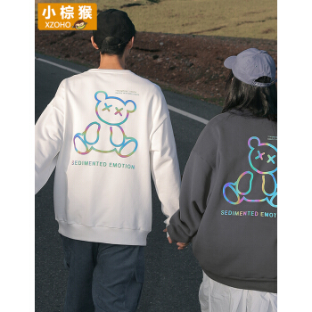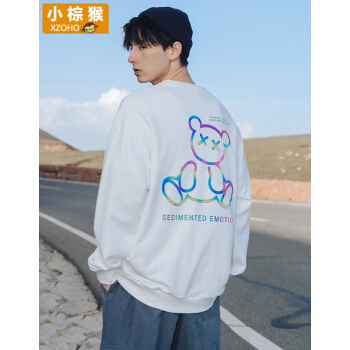 小棕猴 长袖圆领卫衣男秋季宽松白色炫彩反光潮牌小熊新款长袖T恤男宽松潮ins港风情侣卫衣男 G3045本白色 L |