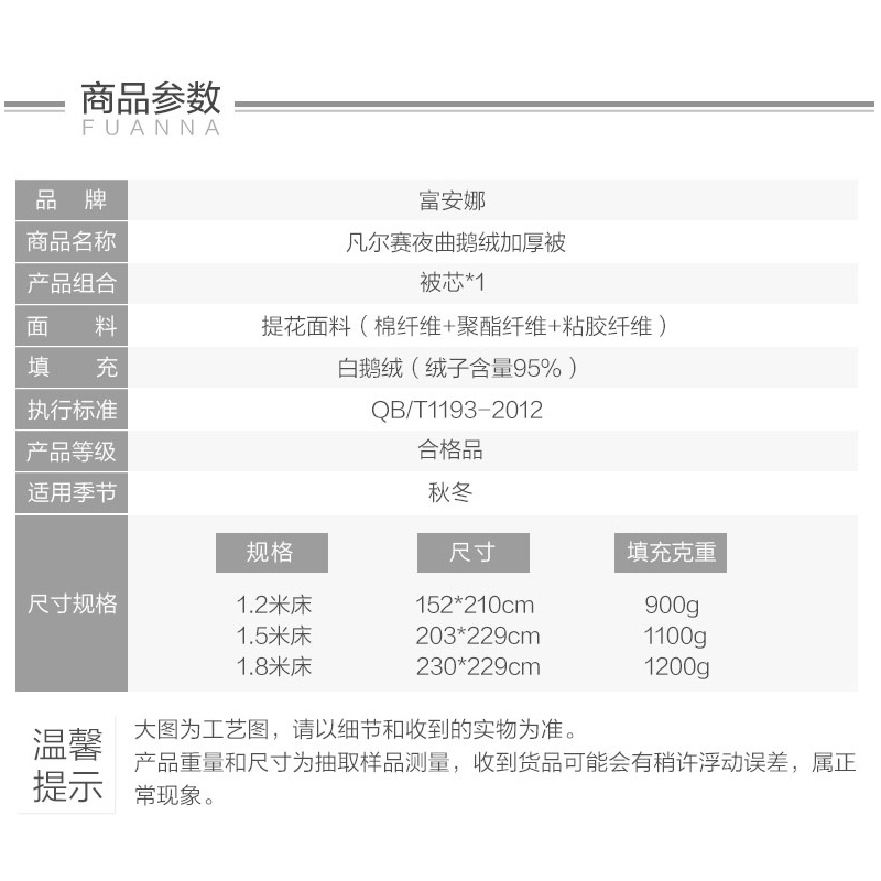 凡尔赛夜曲鹅绒加厚被(被芯1件)(适合1.2米床)【面料:涤竹棉提花;95%白鹅绒/灰】 |