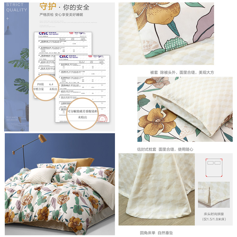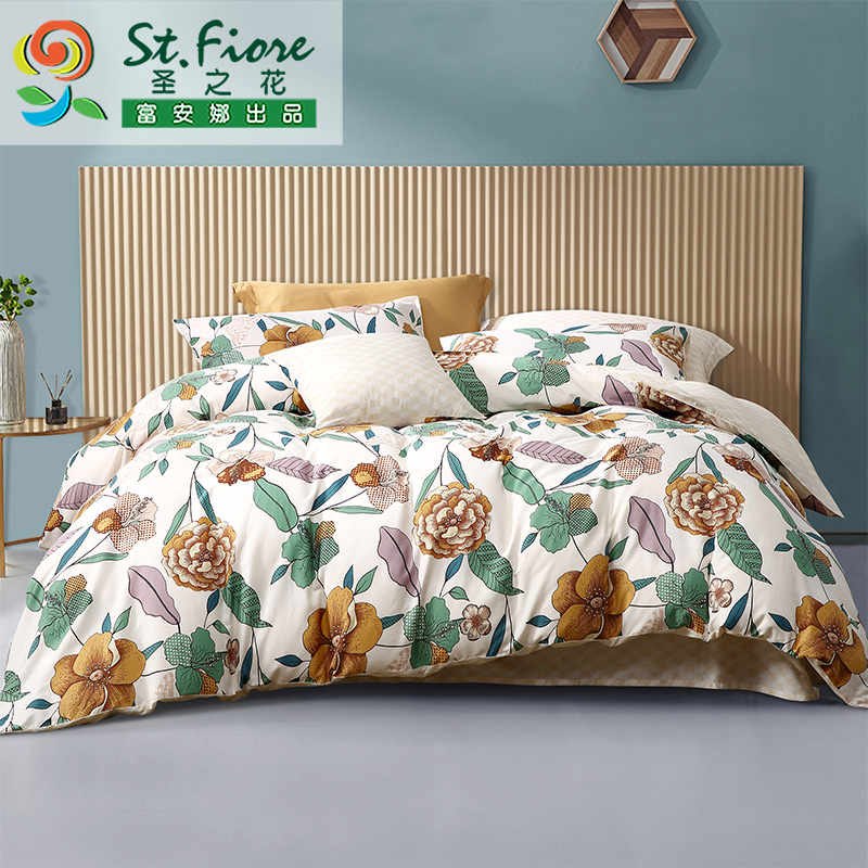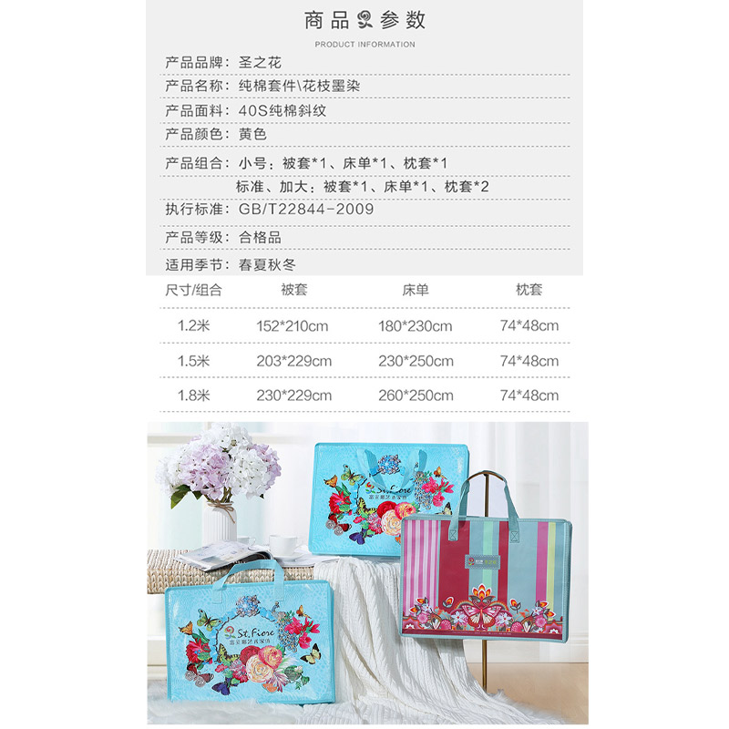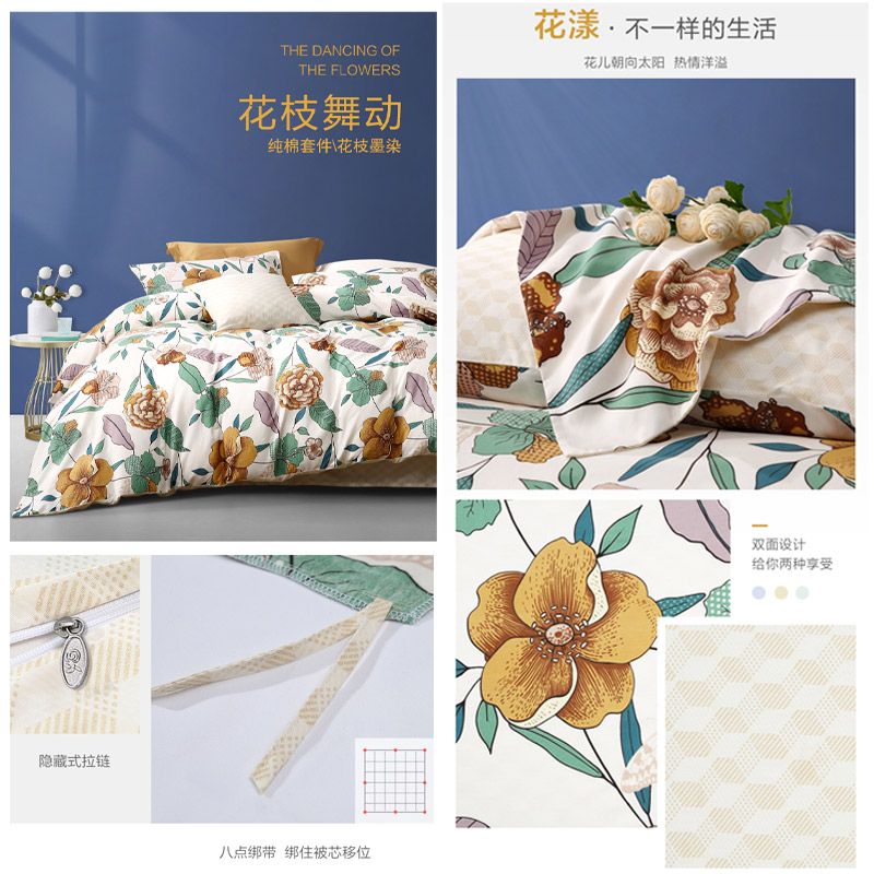 花枝墨染 床单三件套(被套1件床单1件枕套1件)(适合1.2米床)【纯棉/黄】 |