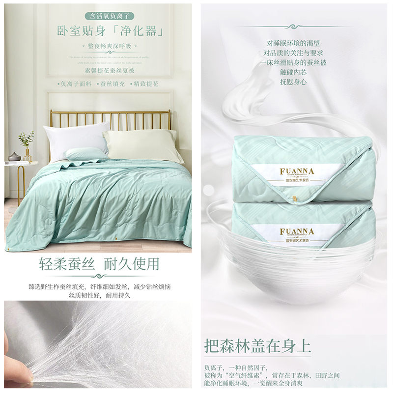 素馨负离子提花蚕丝夏被(夏被1件)(适合1.8米床)【面料:聚酯纤维;填充:柞蚕丝(中长丝绵)/绿】 |