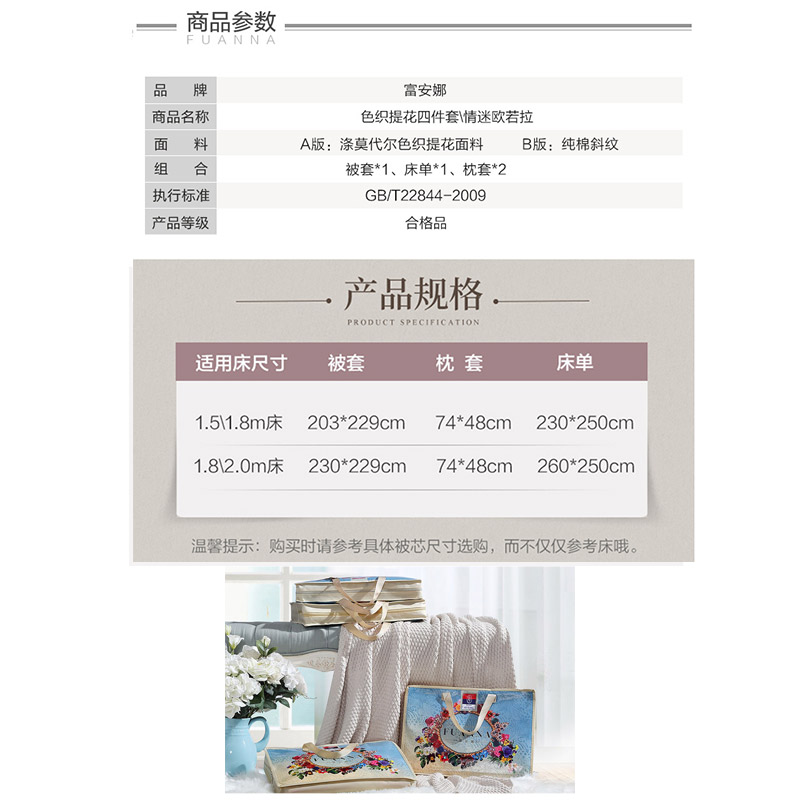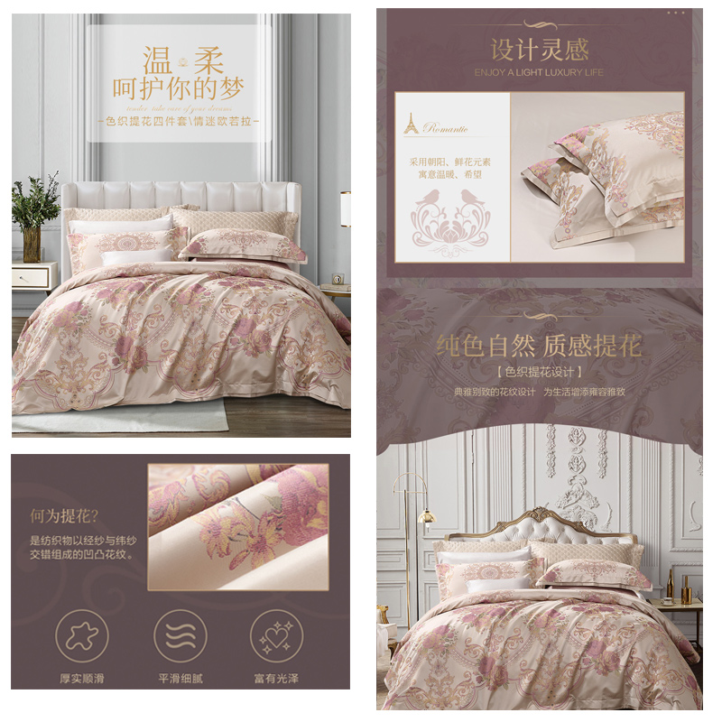 情迷欧若拉 床单四件套(被套1件床单1件枕套2件)(适合1.8米床)【A版:涤莫代尔色织提花面料;B版:纯棉/浅黄】 |