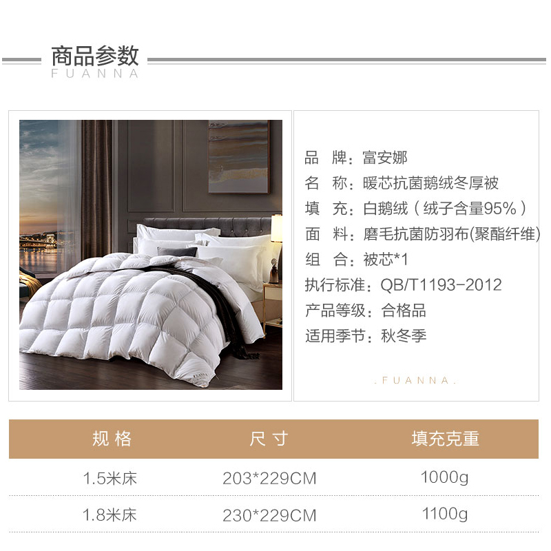 暖芯抗菌鹅绒冬厚被(被芯1件)(适合1.5米床)【面料:抗菌聚酯纤维;填充:95%白鹅绒/白】 |