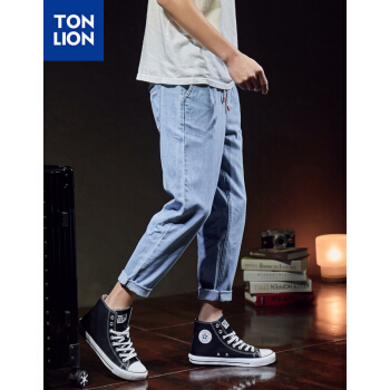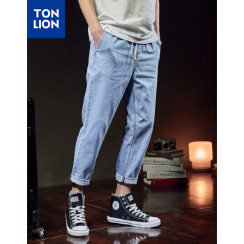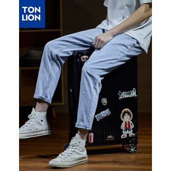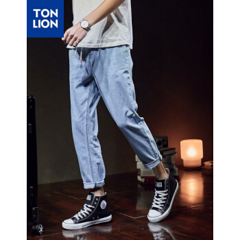 唐狮牛仔裤男夏季新款宽松港风九分裤子男薄款 浅蓝 L |