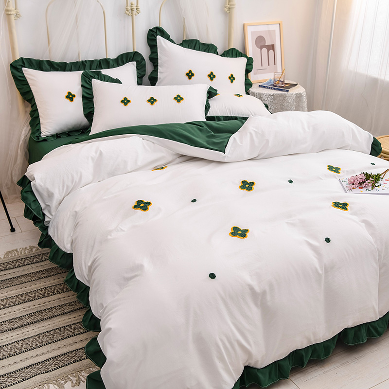 【锦软贴身】泫雅花毛巾绣荷叶边四件套【聚酯纤维/四叶草-白绿】 |