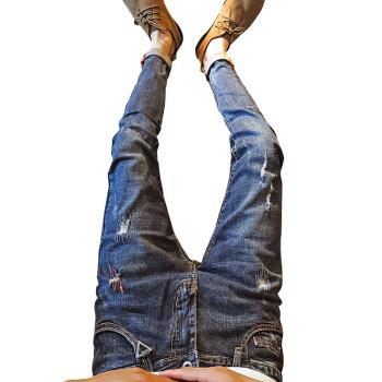 JAZKY破洞牛仔裤男修身小脚弹力直筒韩版潮流乞丐裤子春夏季九分裤 CC-175-NZK浅蓝色 34 |