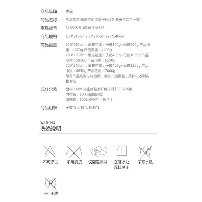 抗菌负离子远红外桑蚕丝二合一被(子被*1 母被*1)【面料:再生纤维素纤维、棉/溯源传奇·甄享抗菌负离子远红外桑蚕丝二合一被】 |