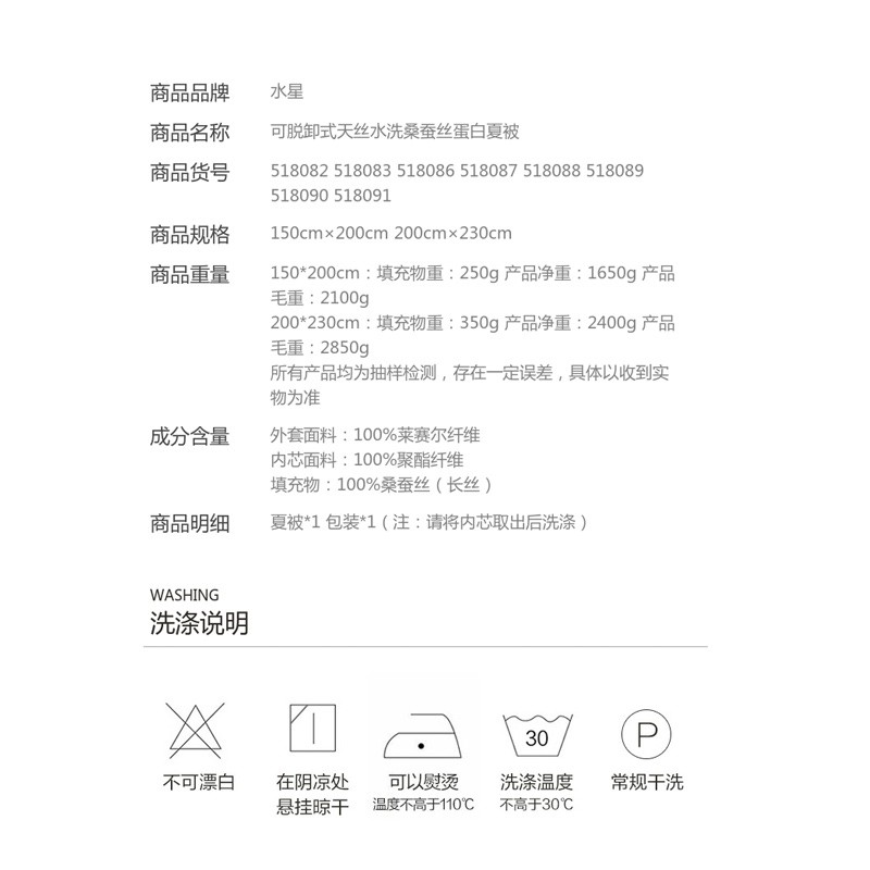 可脱卸式天丝水洗桑蚕丝蛋白夏被(夏被*1)【外套面料:莱赛尔纤维 填充物:桑蚕丝(长丝)/(恩莎)】 |