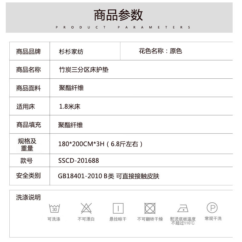 竹炭三分区床护垫【面料:聚酯纤维 填充:聚酯纤维/原色】 |