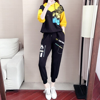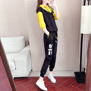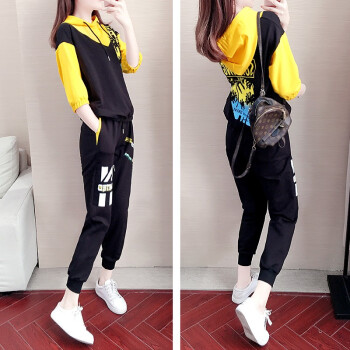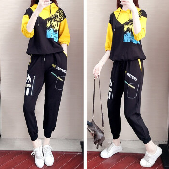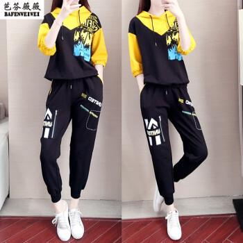 芭芬薇薇运动休闲套装女时尚秋季新款宽松七分袖连帽卫衣洋气两件套潮 黑色两件套 S |