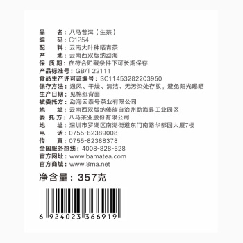 八马茶业 茶叶 黑茶 云南普洱茶生普 生茶茶饼 357g |