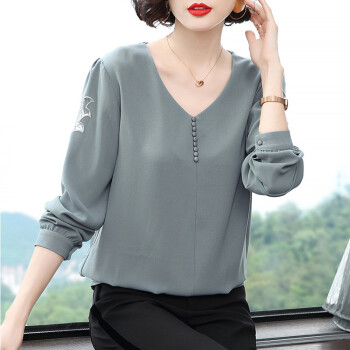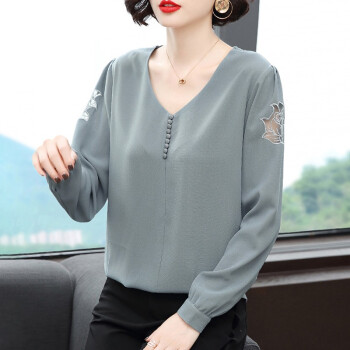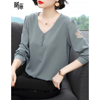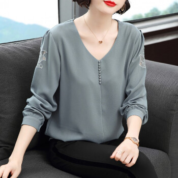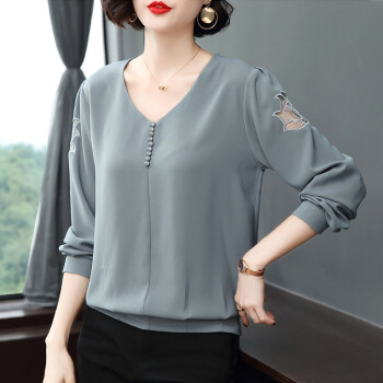 【精选好货】晞薇雪纺上衣新款春夏装时尚简约打底衫中年妈妈大码长袖T恤女洋气小衫遮肚宽松 浅灰蓝 请拍正确尺码 |
