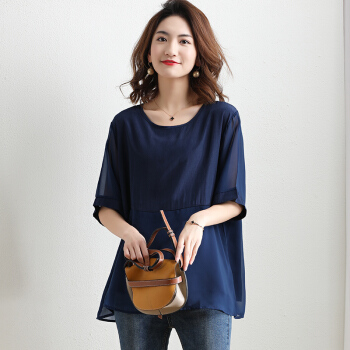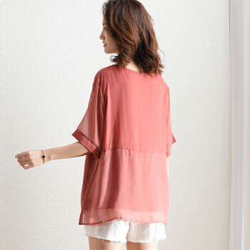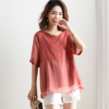 红粉宣言夏季新款宽松套头拼接雪纺衫女短袖大码女装 粉色 L |