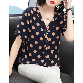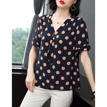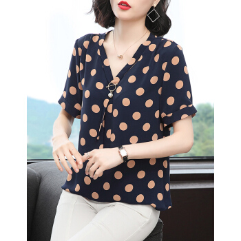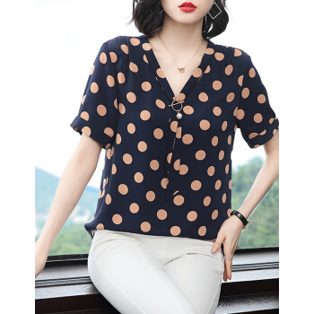 【精选好货】Hizze波点上衣女夏季新款雪纺衫中年妈妈遮肚小衫短袖雪纺碎花显瘦衬衫圆点衣服 蓝色 M |